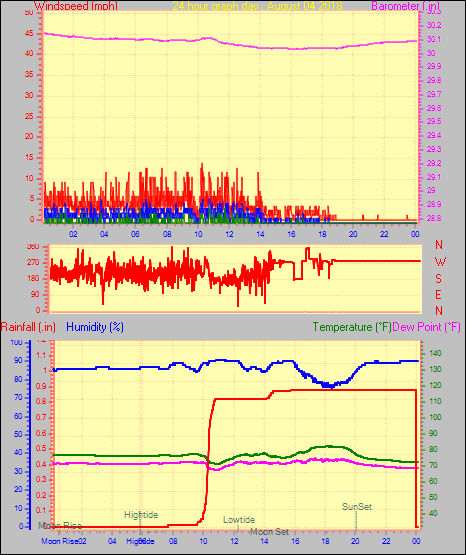 Averages\Extremes for day :07 ------------------------------------------------------------ Average temperature = 79.8°F Average humidity = 80% Average dewpoint = 72.9°F Average barometer = 30.0 in. Average windspeed = 1.7 mph Average gustspeed = 4.1 mph Average direction = 222° ( SW) Rainfall for month = 0.94 in. Rainfall for year = 30.50 in. Rainfall for day = 0.06 in. Maximum rain per minute = 0.01 in. on day 07 at time 23:09 Maximum temperature = 87.8°F on day 07 at time 14:29 Minimum temperature = 72.0°F on day 07 at time 23:59 Maximum humidity = 90% on day 07 at time 23:59 Minimum humidity = 64% on day 07 at time 15:05 Maximum dewpoint = 76.6°F on day 07 at time 11:14 Minimum dewpoint = 68.7°F on day 07 at time 22:39 Maximum pressure = 30.016 in. on day 07 at time 07:48 Minimum pressure = 29.902 in. on day 07 at time 17:34 Maximum windspeed = 6.9 mph on day 07 at time 17:51 Maximum gust speed = 16.1 mph from 259 °( W ) on day 07 at time 17:53 Daily wind run = 039.6miles Maximum heat index = 98.5°F on day 07 at time 14:28 Click here for todays 24 hour graph :7 :8 :2018