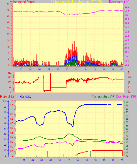 Maximum windspeed = 17.3 mph from 257°(WSW) on day 11 at time 18:07