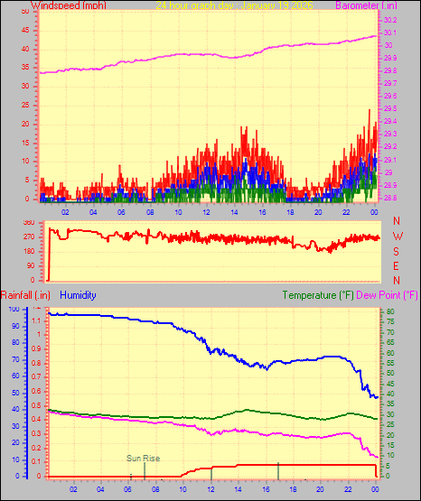 Maximum gust speed = 26.5 mph from 278 °( W ) on day 01 at time 13:51